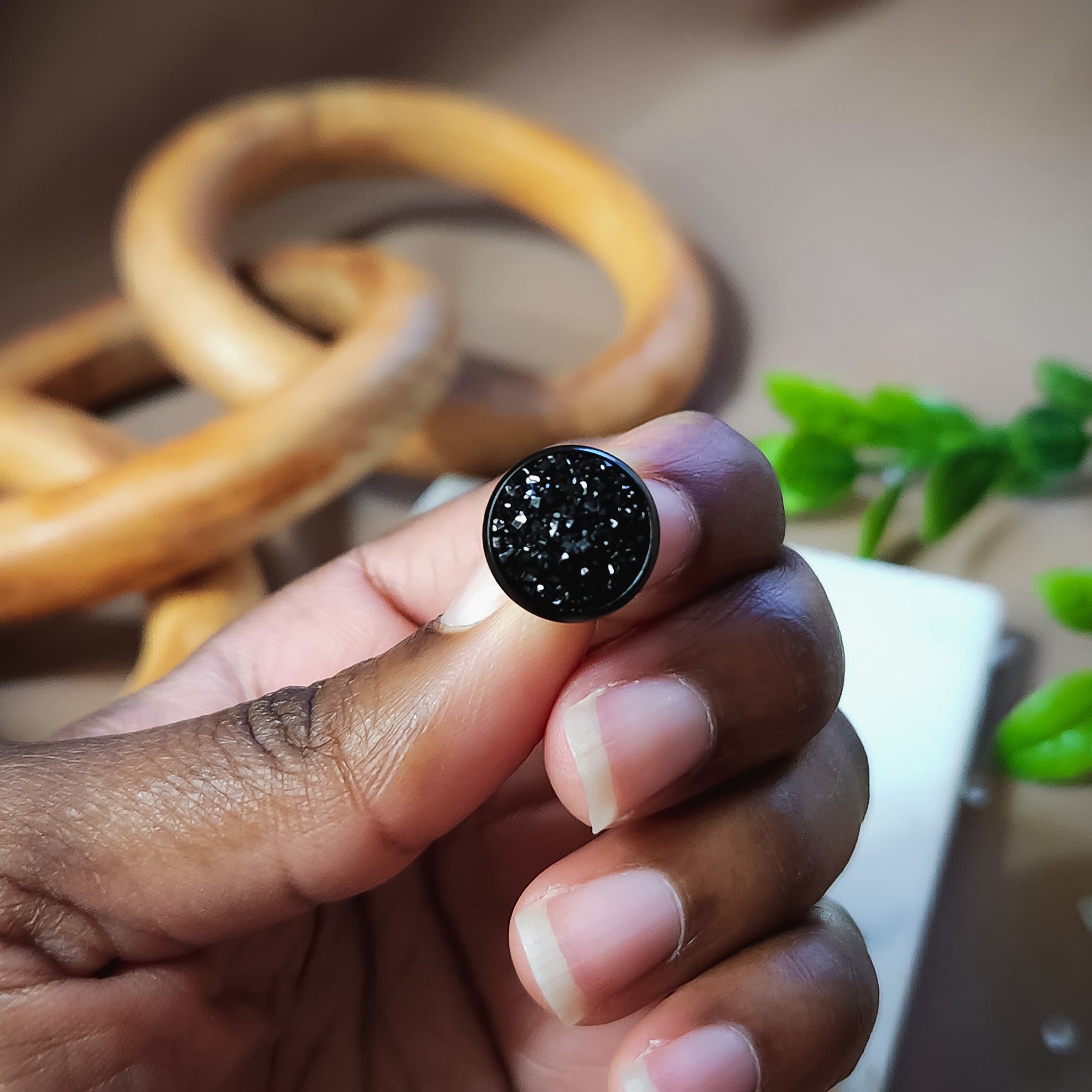 Put the sparkle back in your wardrobe with these dazzling Black Rim Druzy Studs! Filled with glitter-infused resin, these lightweight round studs will glimmer in multiple colors, while secured by a hypoallergenic stainless steel casing, in black. Ready to light up your outfit? Add some Druzy Studs and you'll be turning heads in no time!