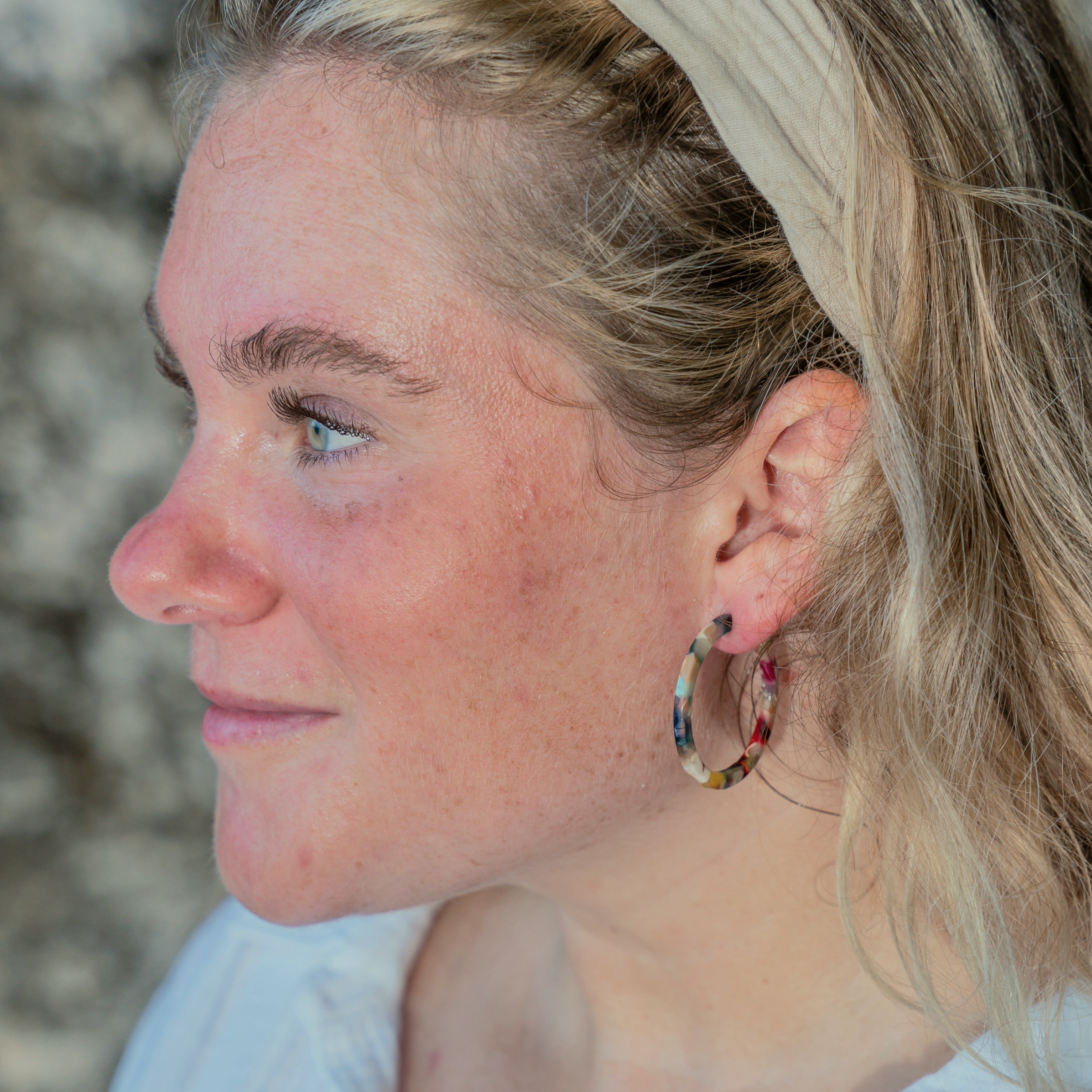 Introducing our Thin Hoop Sassy Girl Dangles - a stunning representation of love, beauty, and sass. These earrings feature a thin hoop shape with a vibrant color palette of pink, white, cream, purple, green, and blue, all crafted with high-quality resin. Get ready to receive compliments!