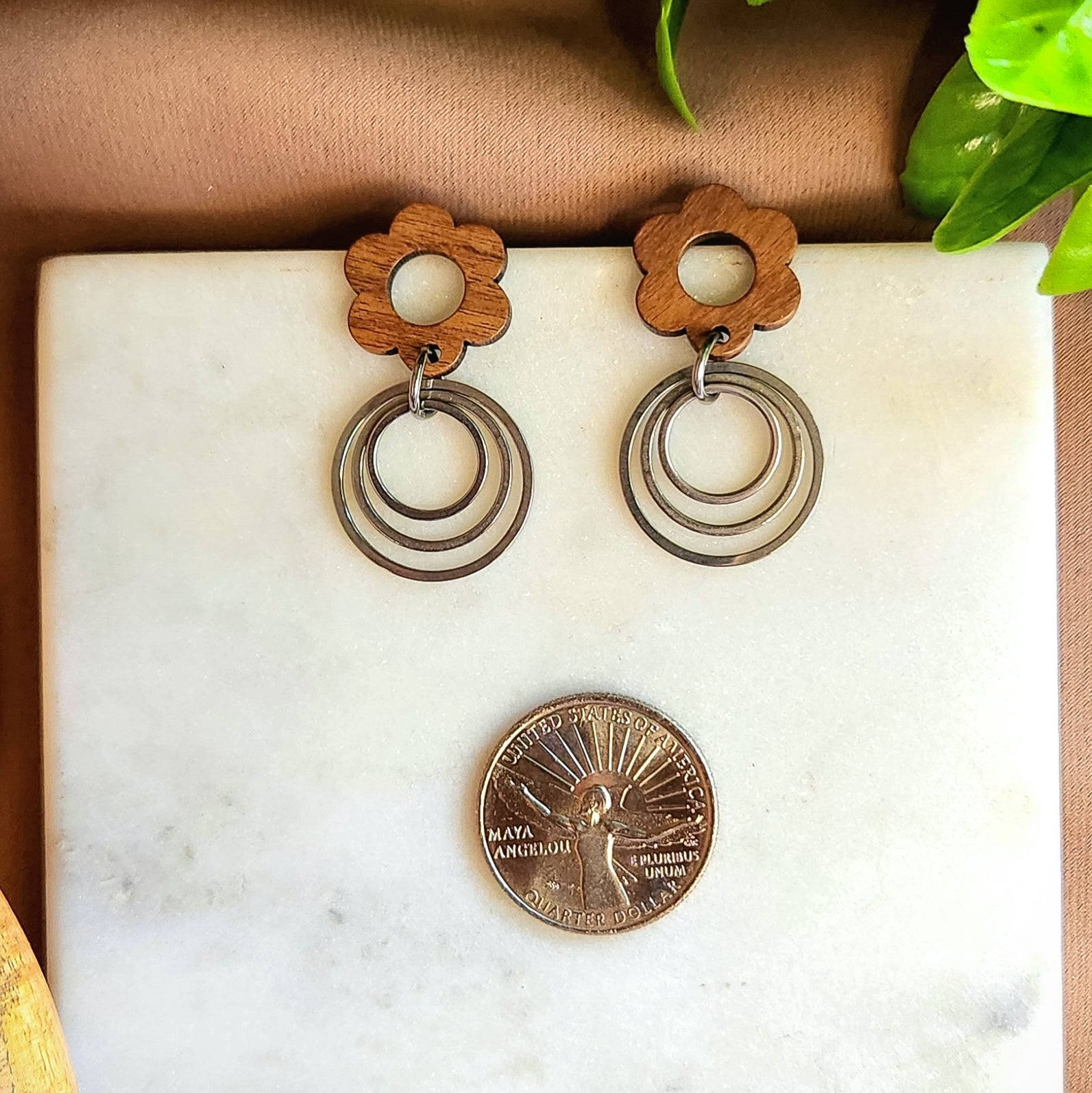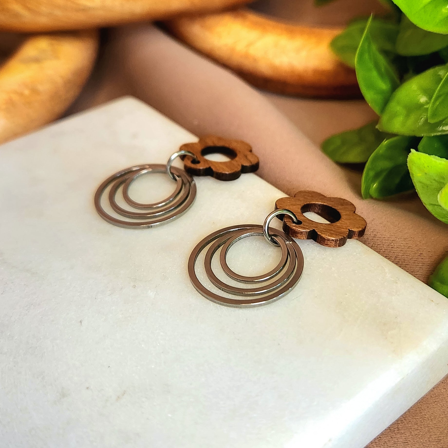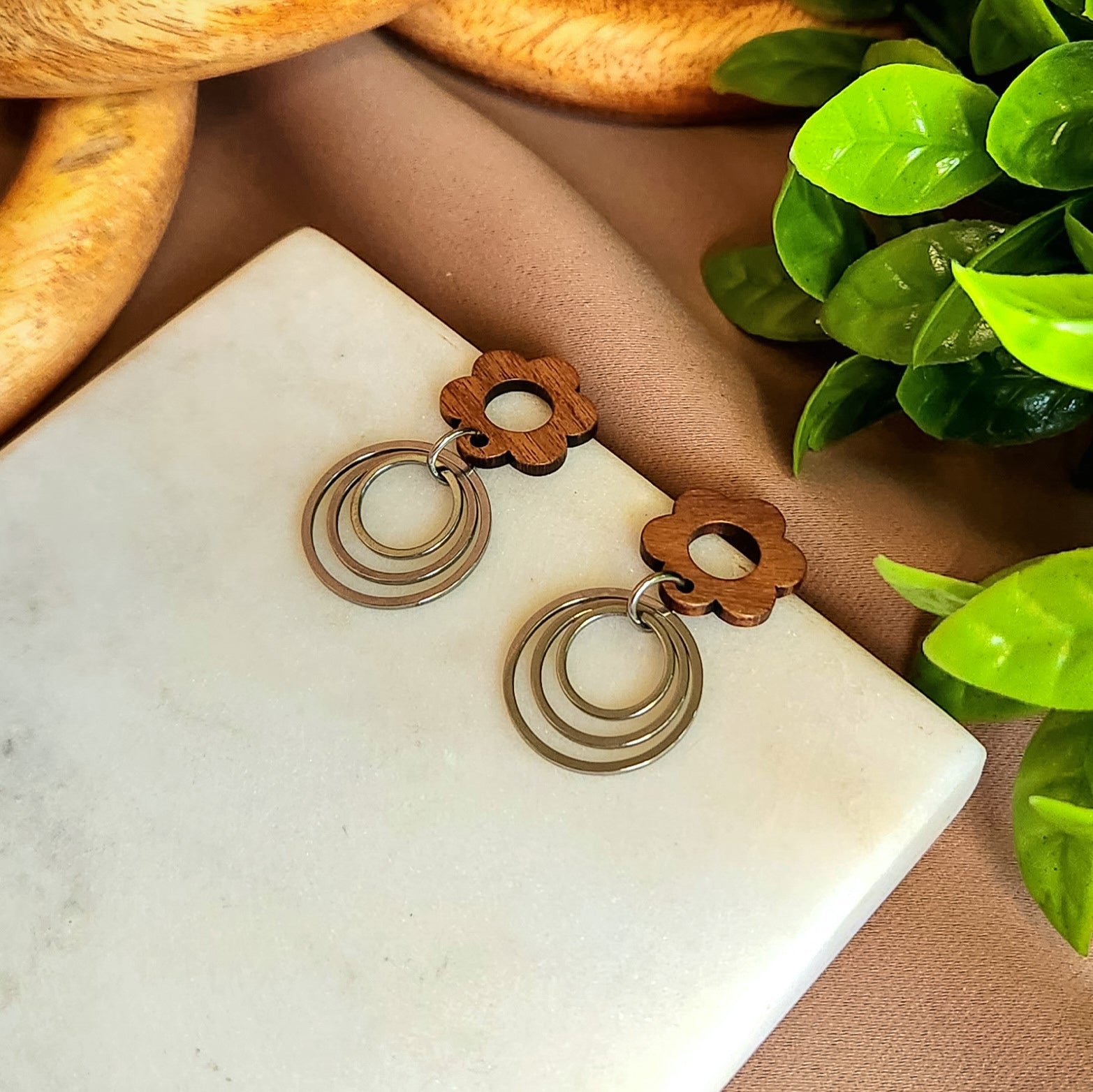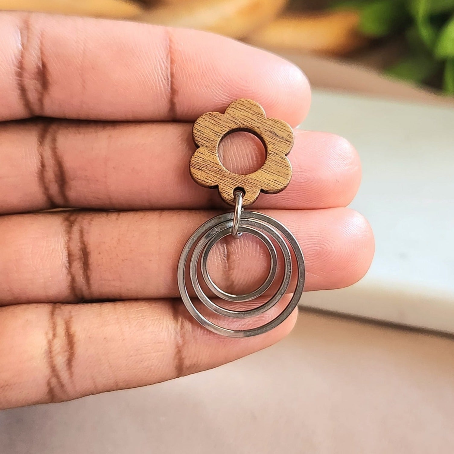 Look stunning with these Deflower Me Dangles! Crafted from wood, these gorgeous earrings feature a flower top with a hollow center and three silver rings dangling below. Get ready to turn heads with these ultra-unique pieces!