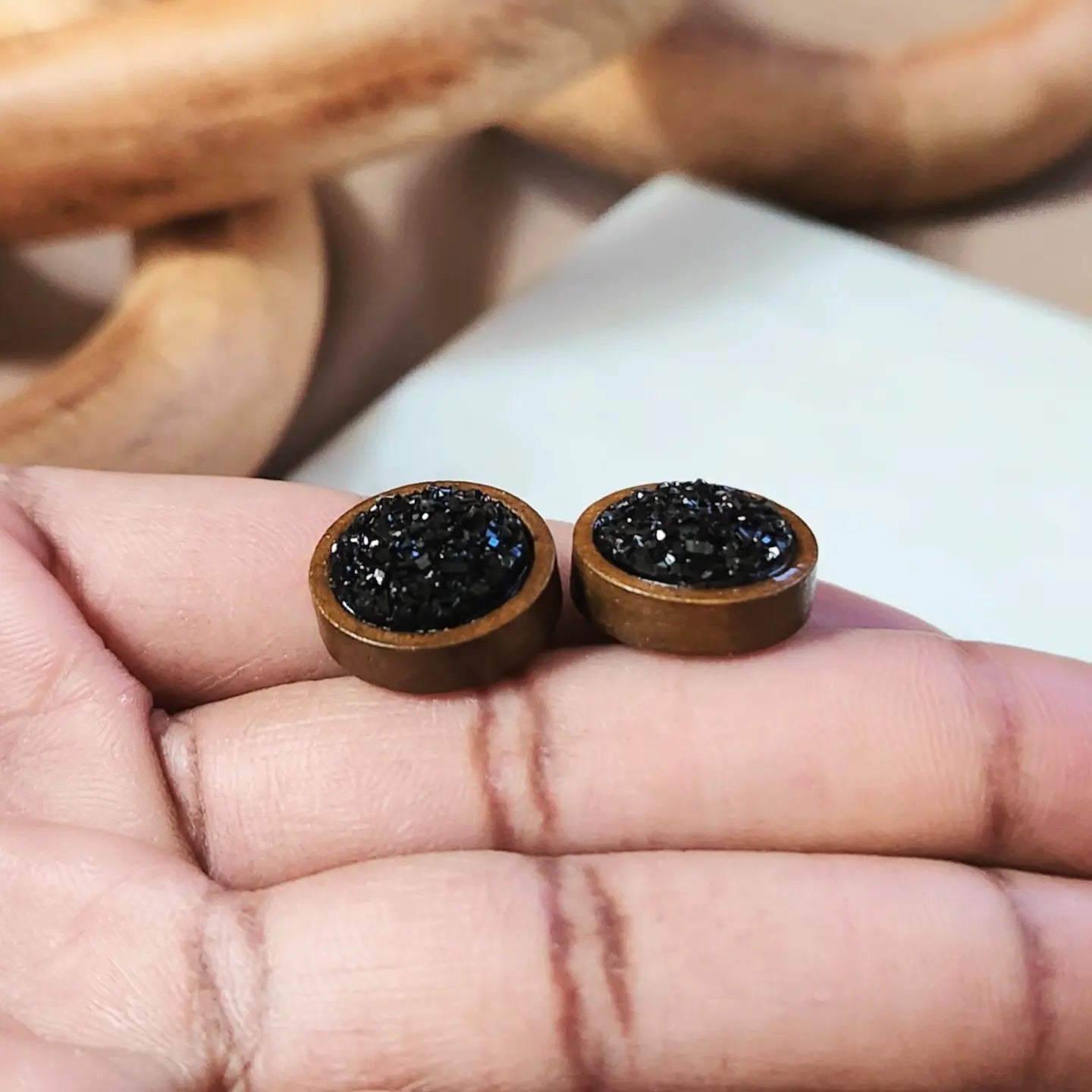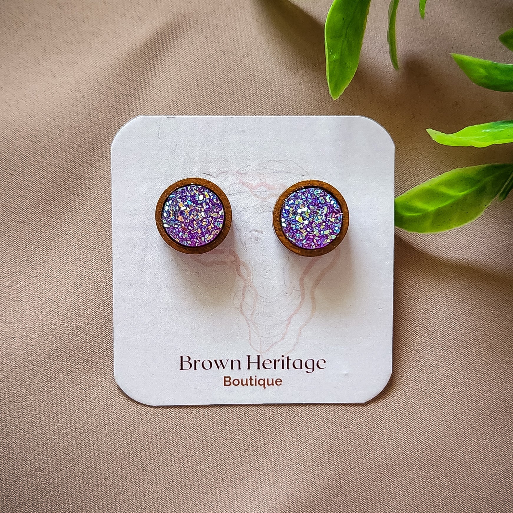 Put the sparkle back in your wardrobe with these dazzling Druzy Studs! Made with a wooden casing, filled with glitter-infused resin, these lightweight round studs will glimmer in multiple colors, while secured by a hypoallergenic stainless steel post, in silver. Ready to light up your outfit? Add some Druzy Studs and you'll be turning heads in no time!