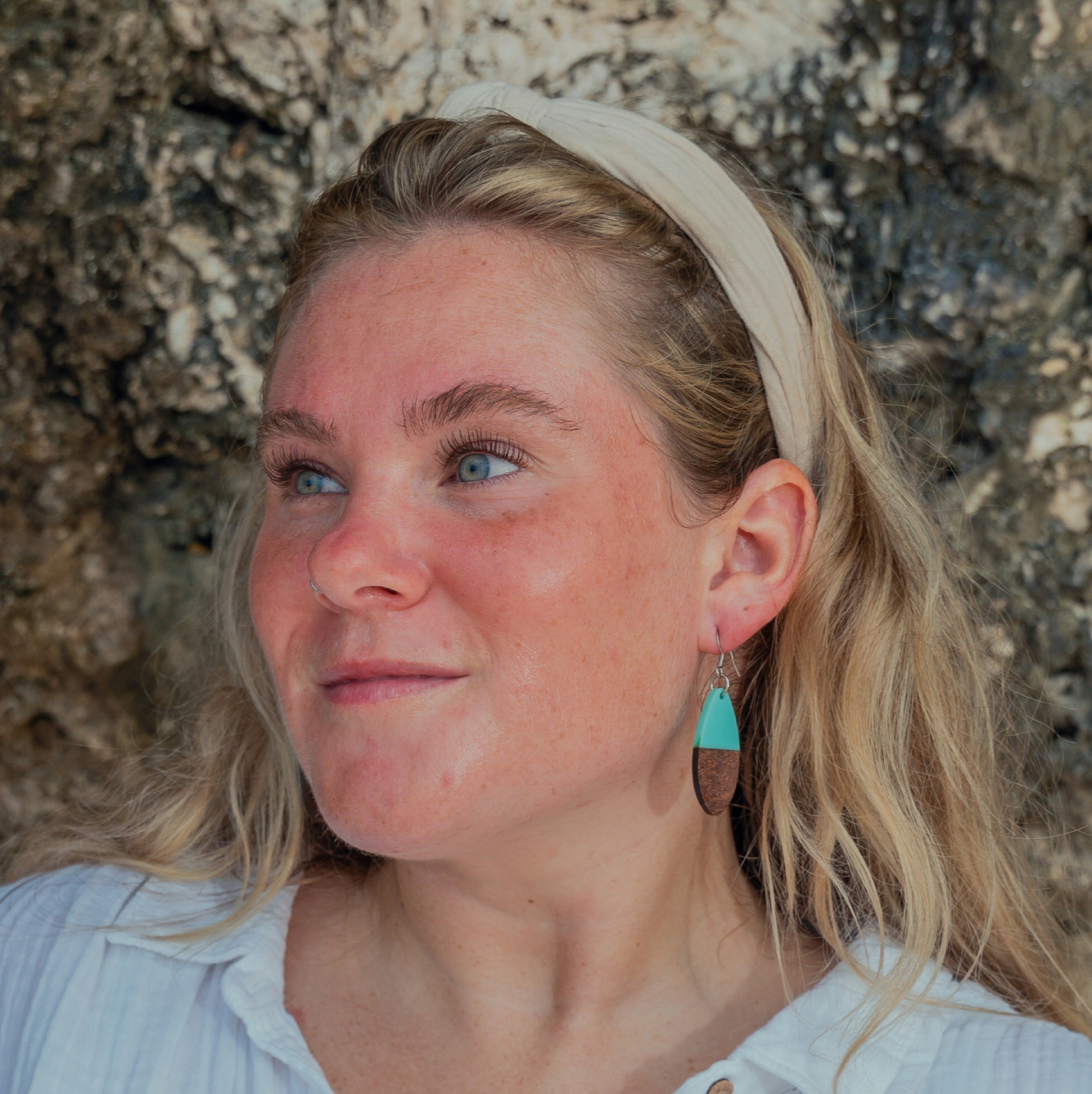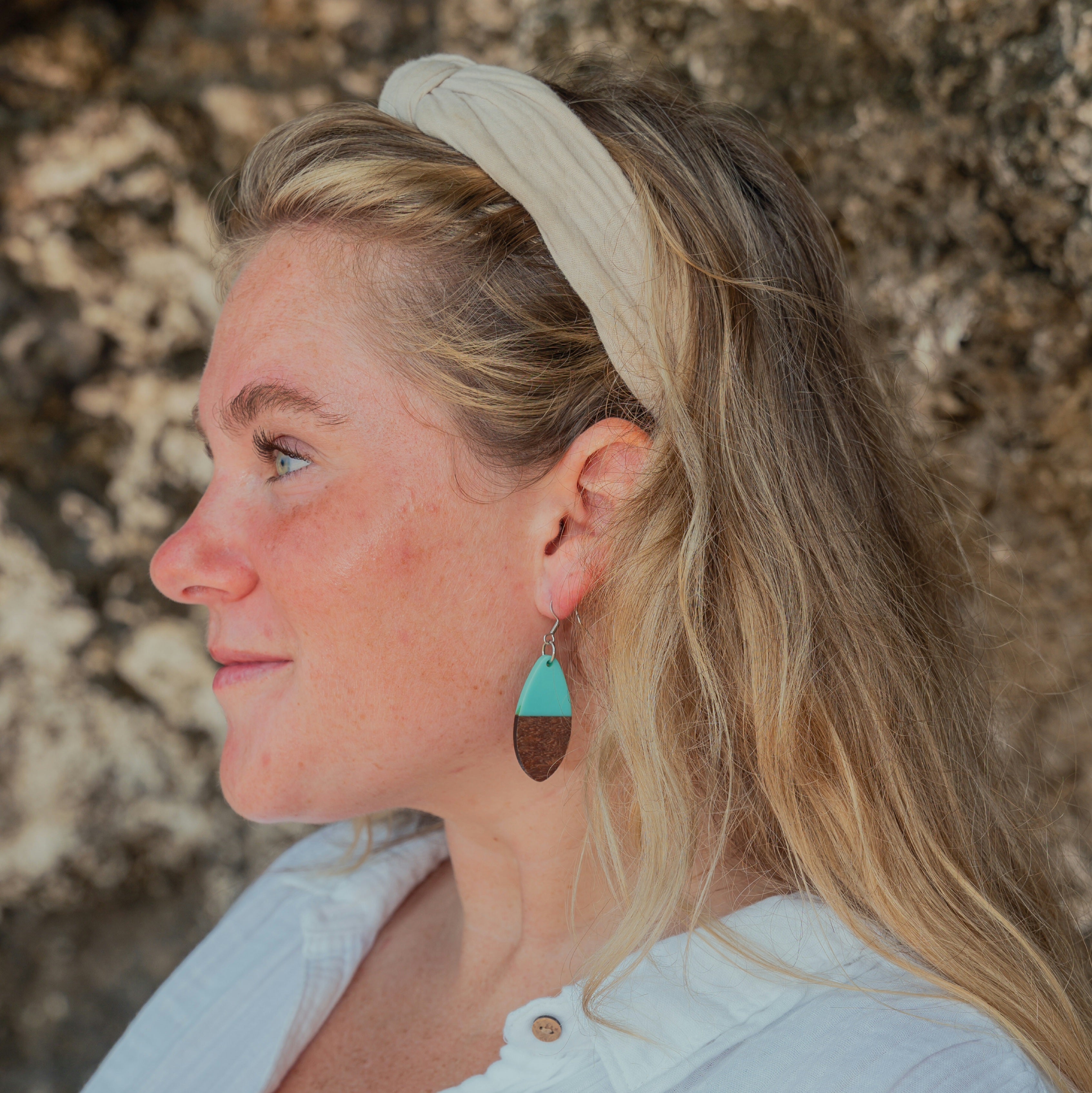 Add a playful pop of color to your outfit with Elaine Dangles! These quirky earrings feature a half wood, half resin design in a bold aqua hue and a unique wide teardrop shape. Your fashion game will be on point with this fun and stylish accessory (and they won't break the bank, either)!