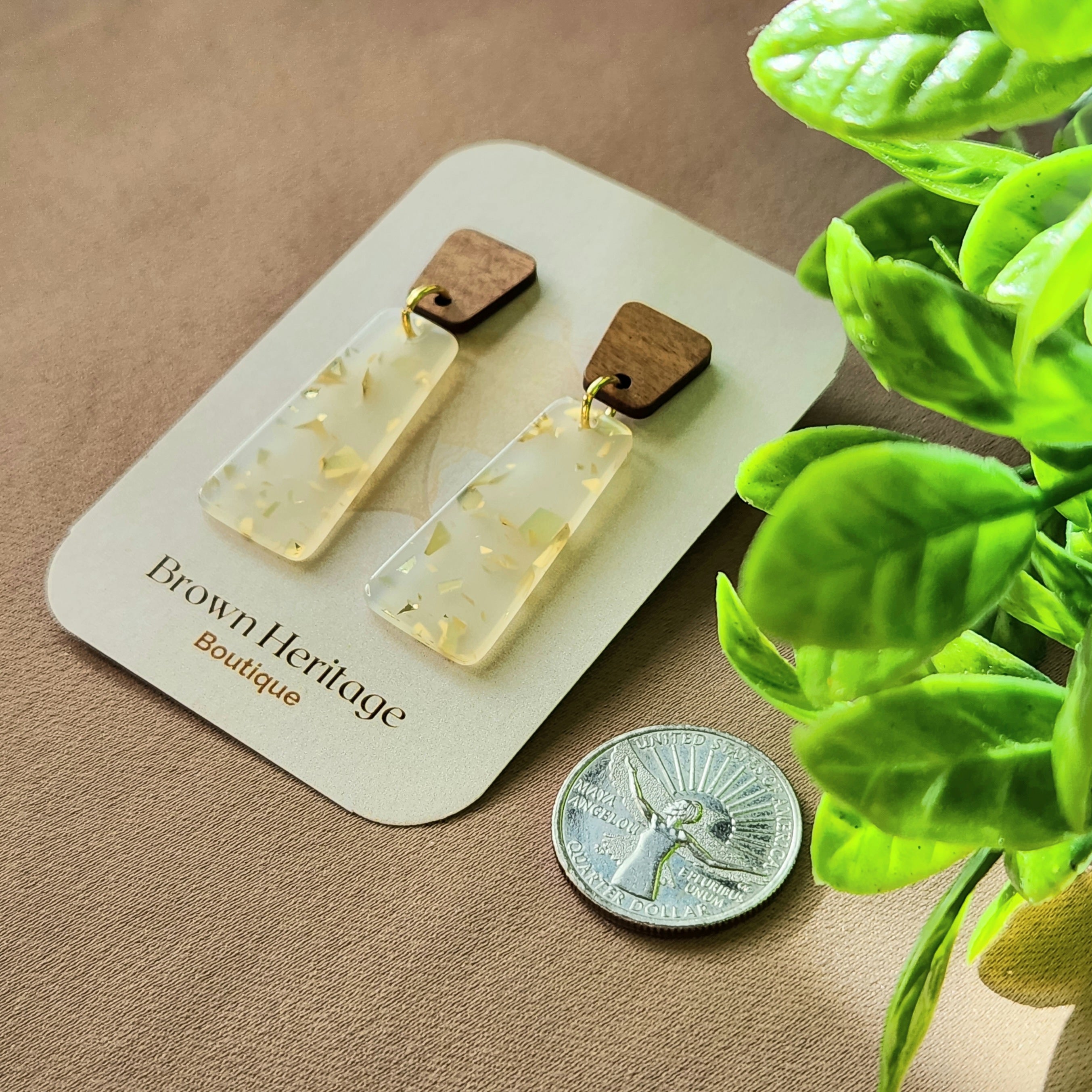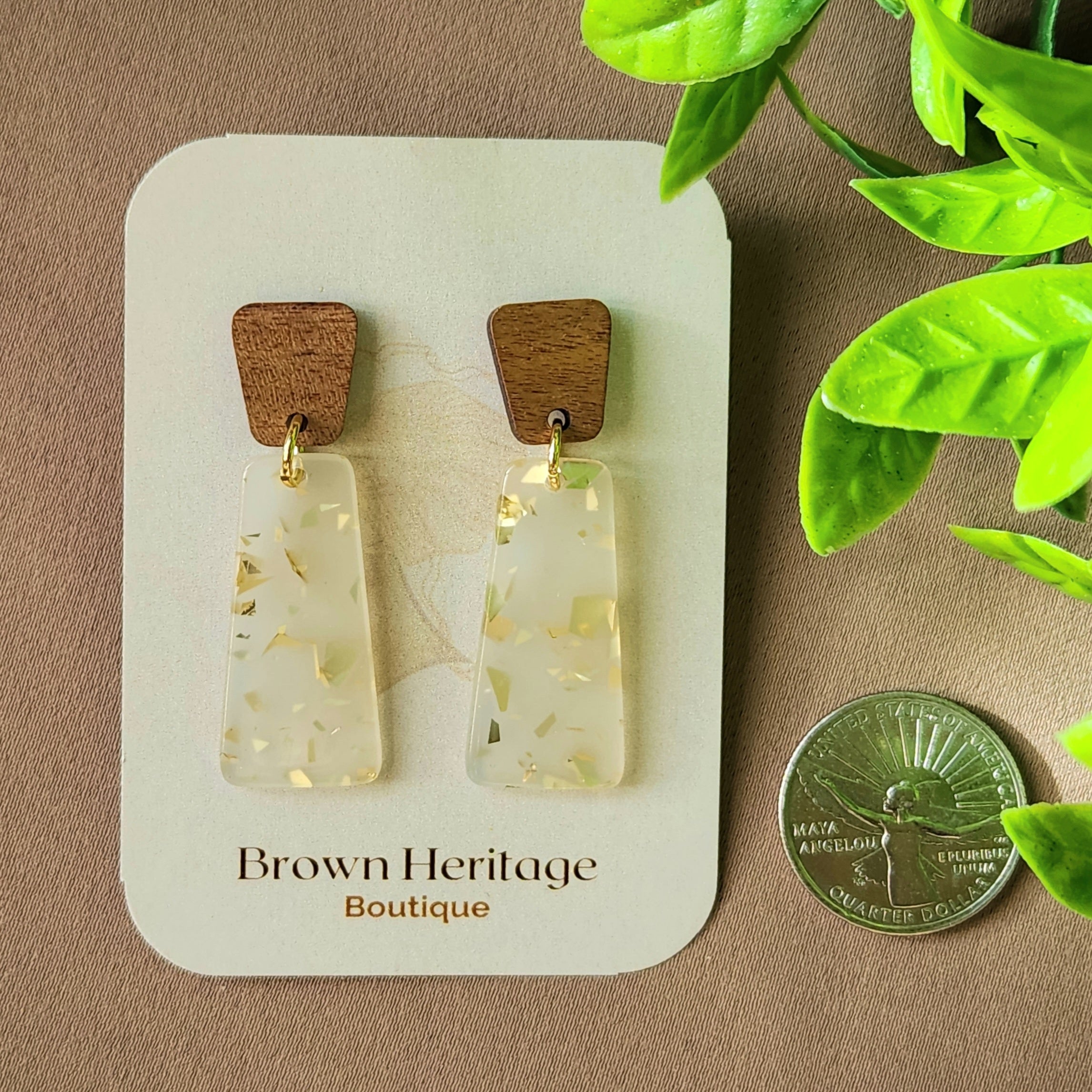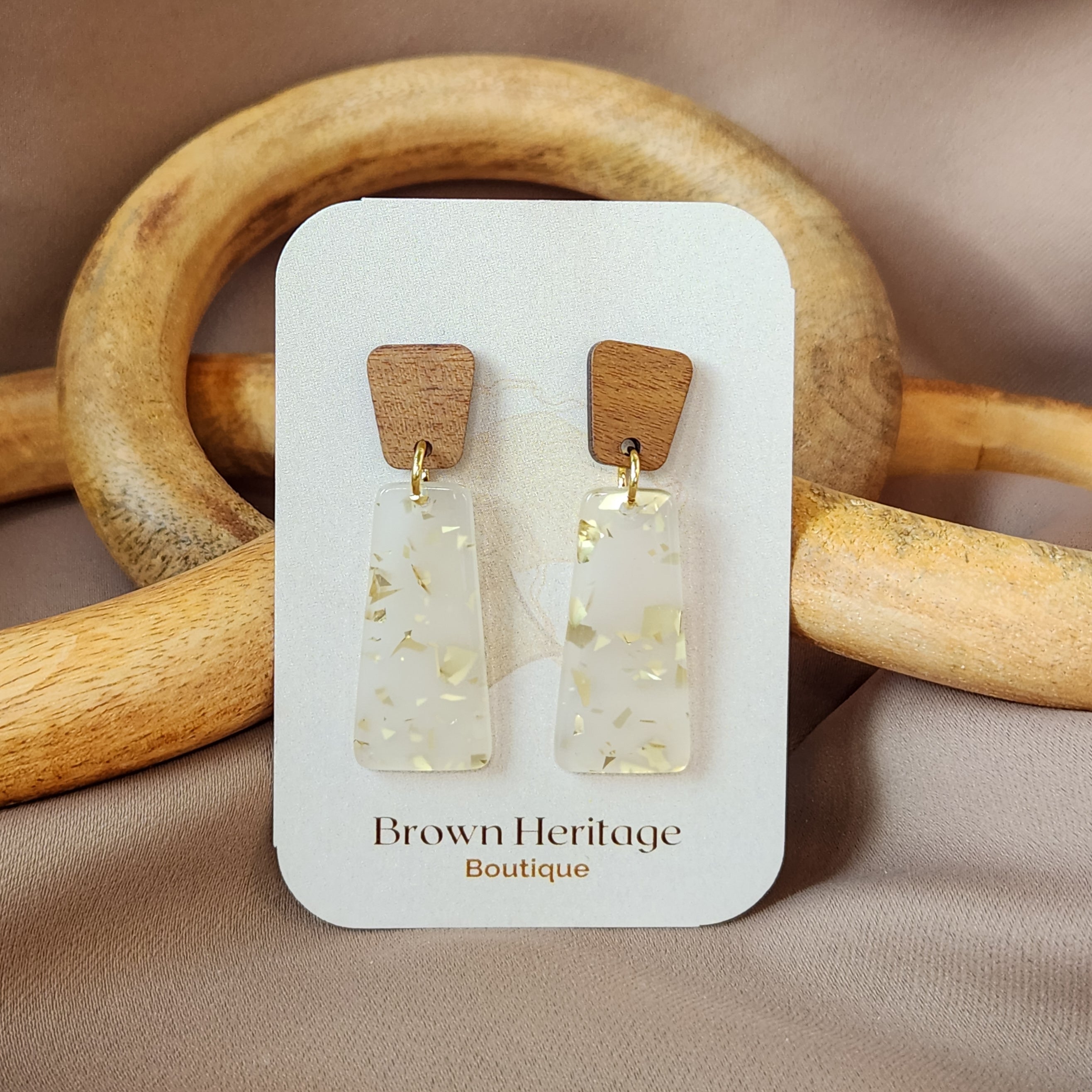 "Add a touch of whimsy to your outfit with our Gold Lace Earrings. These unique earrings feature opague resin with real gold flakes, in a playful trapezoid shape. Complete with a wooden stud post for a fun twist. Dare to be different with these beauties!"