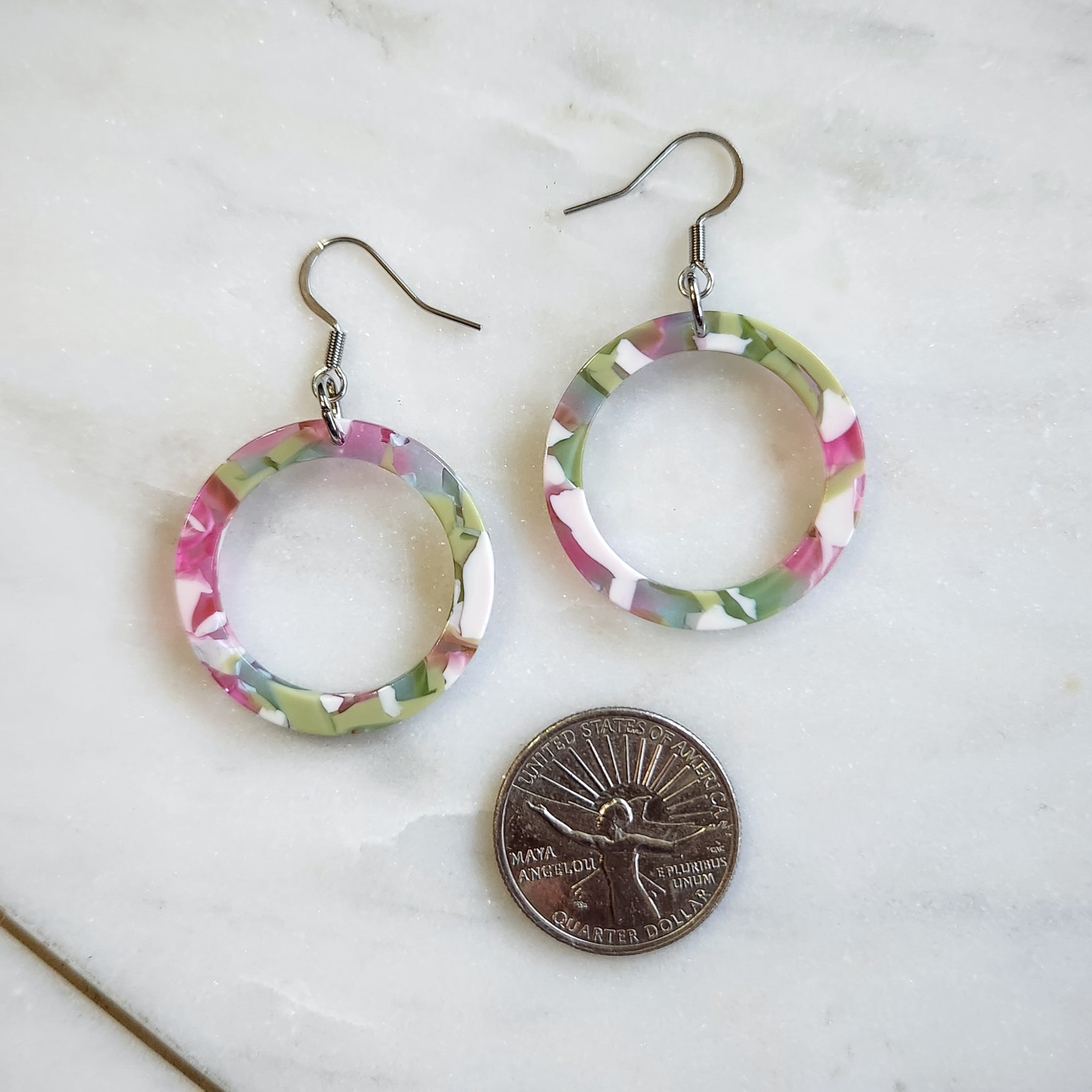 Introducing our Melon Kiss Dangles, the perfect blend of fun and elegance. These medium-sized ring earrings, crafted from lightweight transparent blue resin, feature playful pops of hot pink, green, and white resin mixed in. Their vibrant colors and comfortable design make them an ideal choice for adding a touch of joy and style to any outfit. Embrace a fresh and vibrant look with Melon Kiss Dangles.