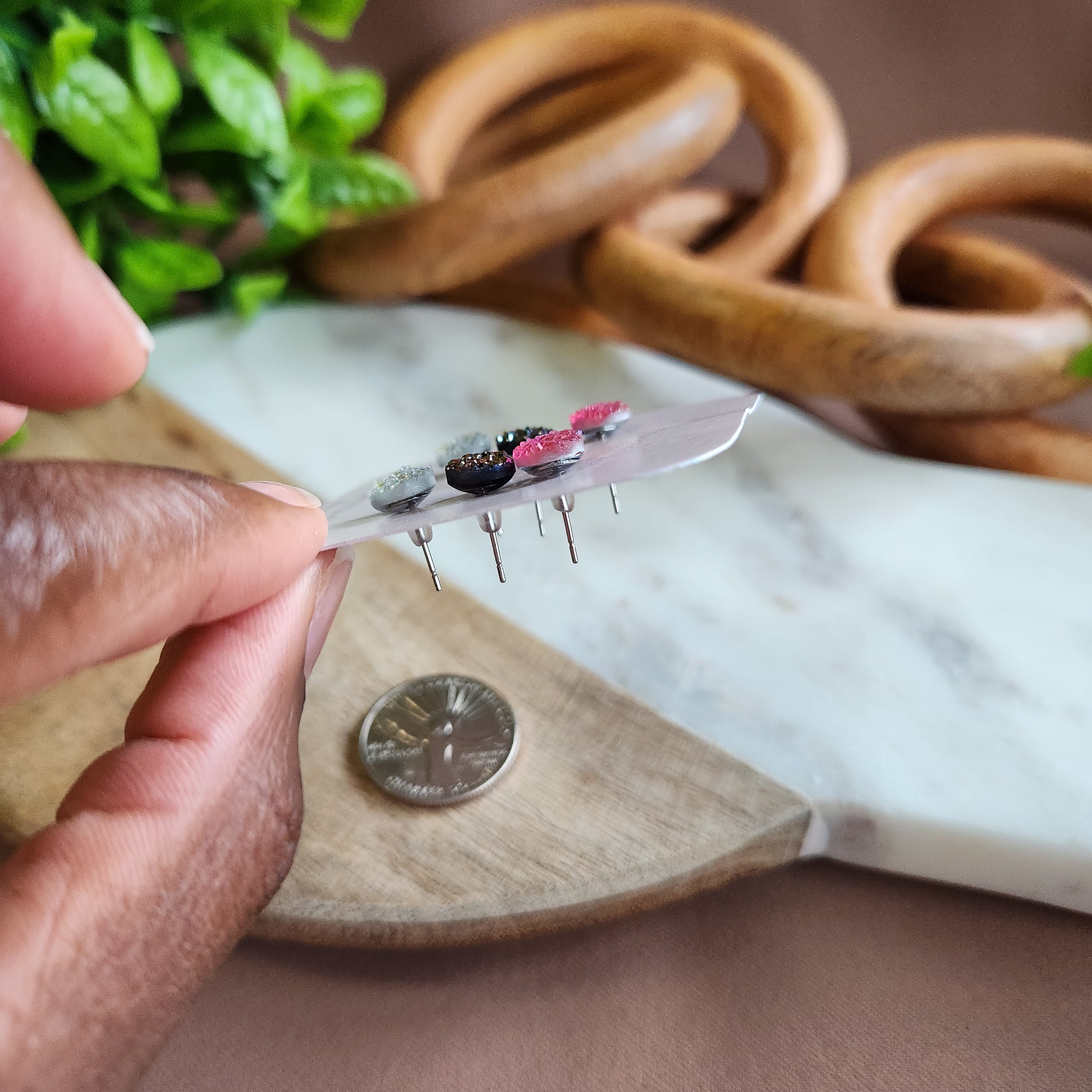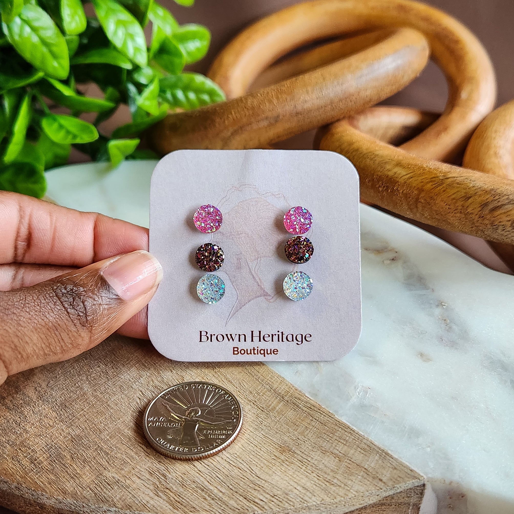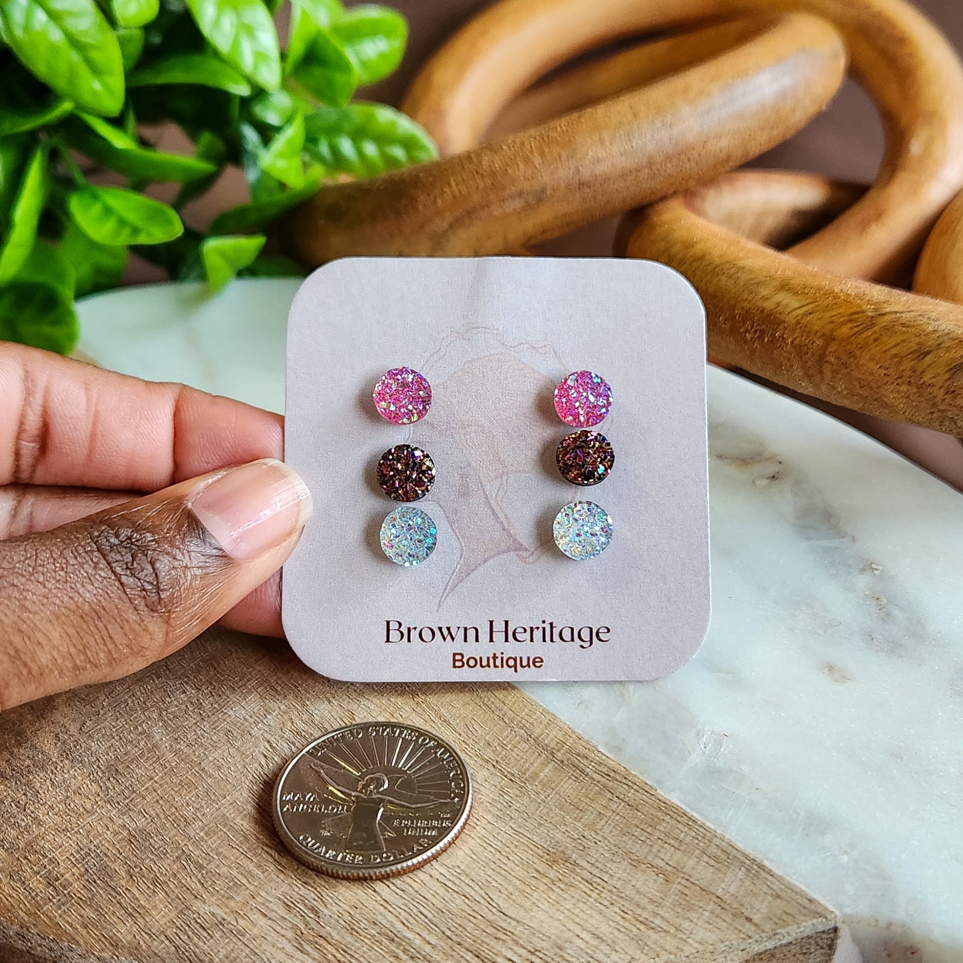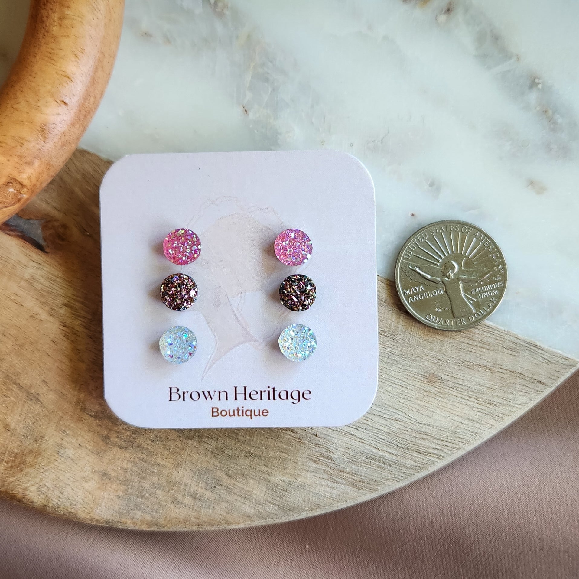 Sparkle and shine with our Mini Druzy Studs in a delicious Neopolitan Trio! Made with glitter resin, these 8mm studs come in three playful colors - pink, fiesta (bronze with rainbow shimmer), and crystal. Plus, the hypoallergenic stainless steel post ensures comfort for all-day wear. Go ahead and treat yourself, these studs are a must-have!