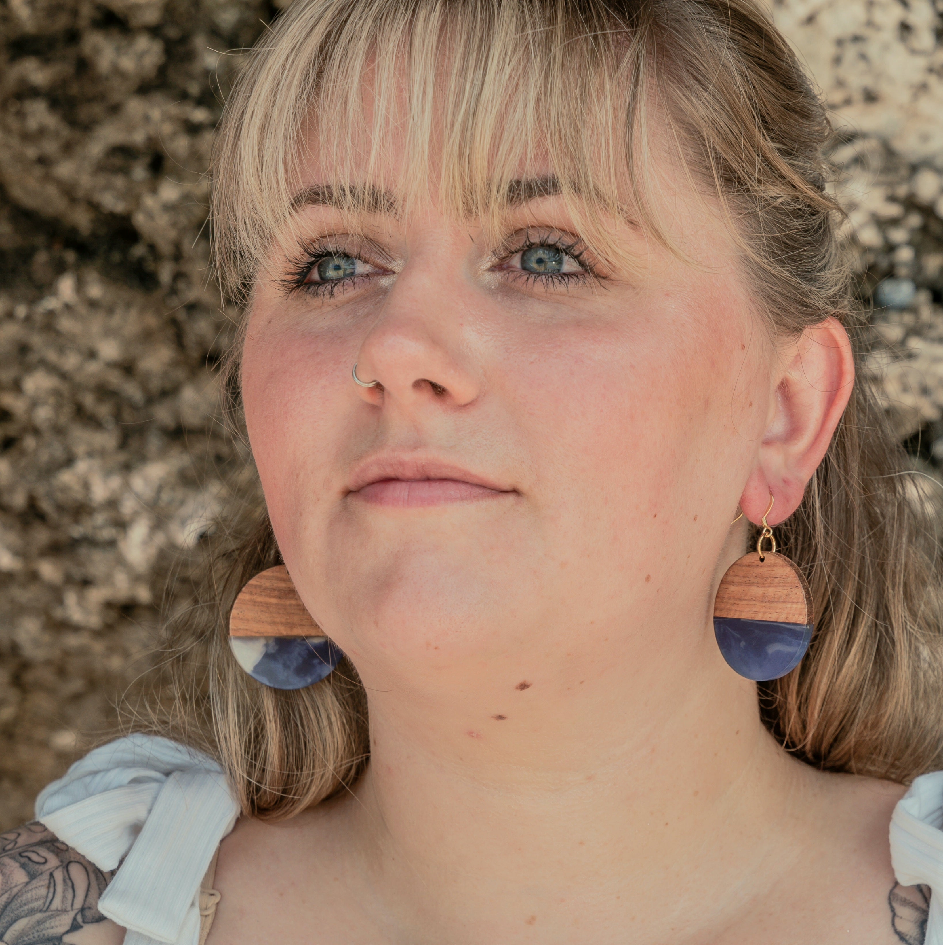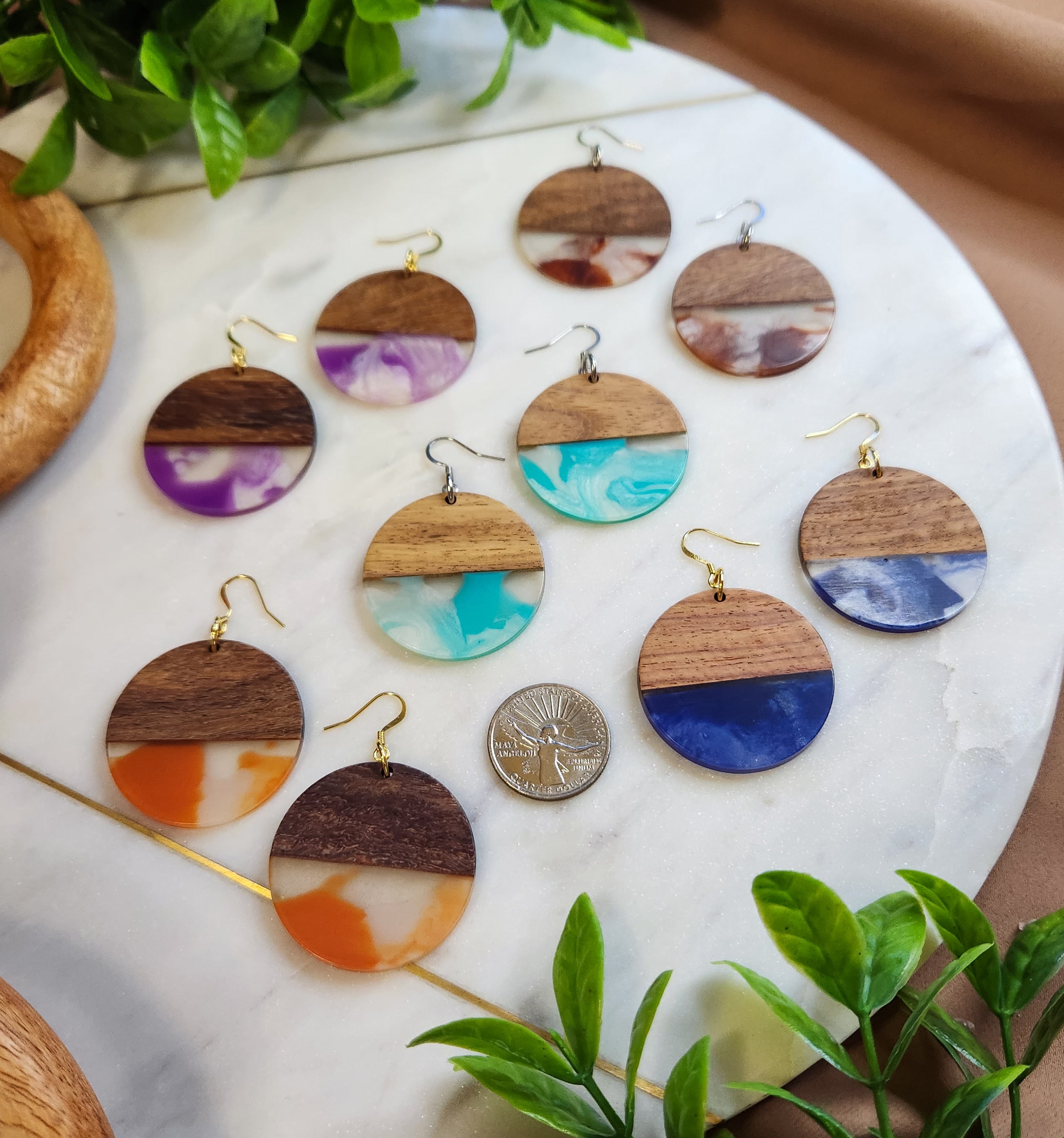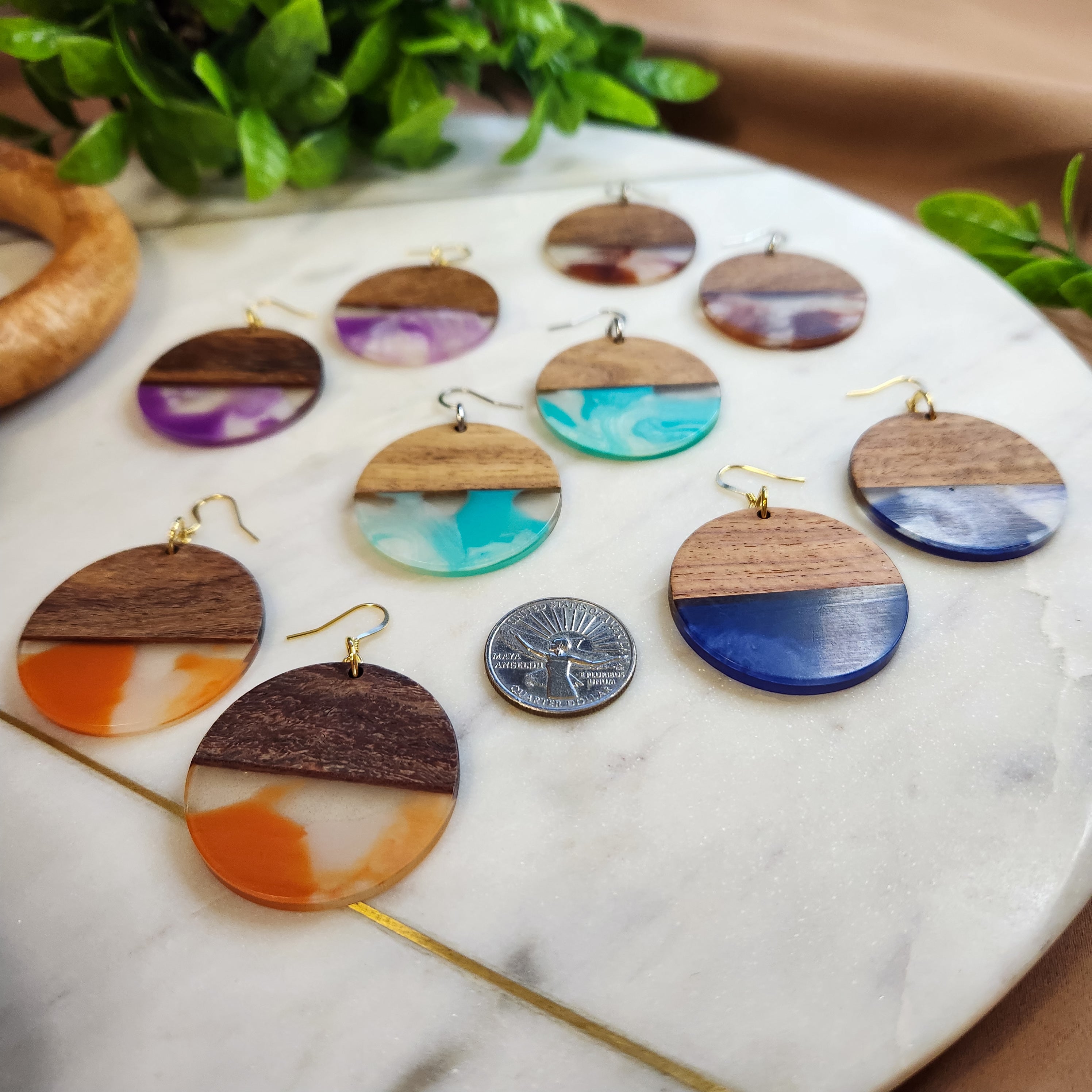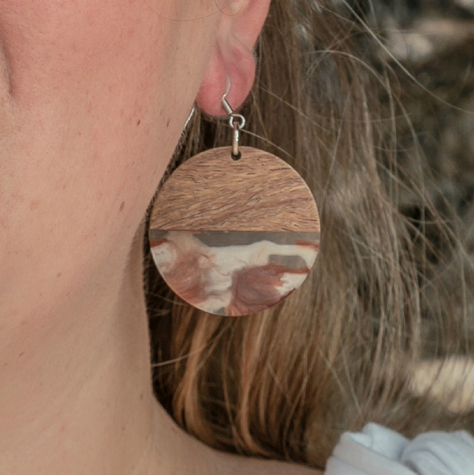 Show off your style with these Oceania Dangles! These large round drops combine wood and clear resin with colored swirls to give you a unique look that'll get you noticed. Choose from 5 colors - brown, orange, navy blue, aqua, and purple - and pick between a golden or silver stainless steel hook. Add some flare and color to your day!