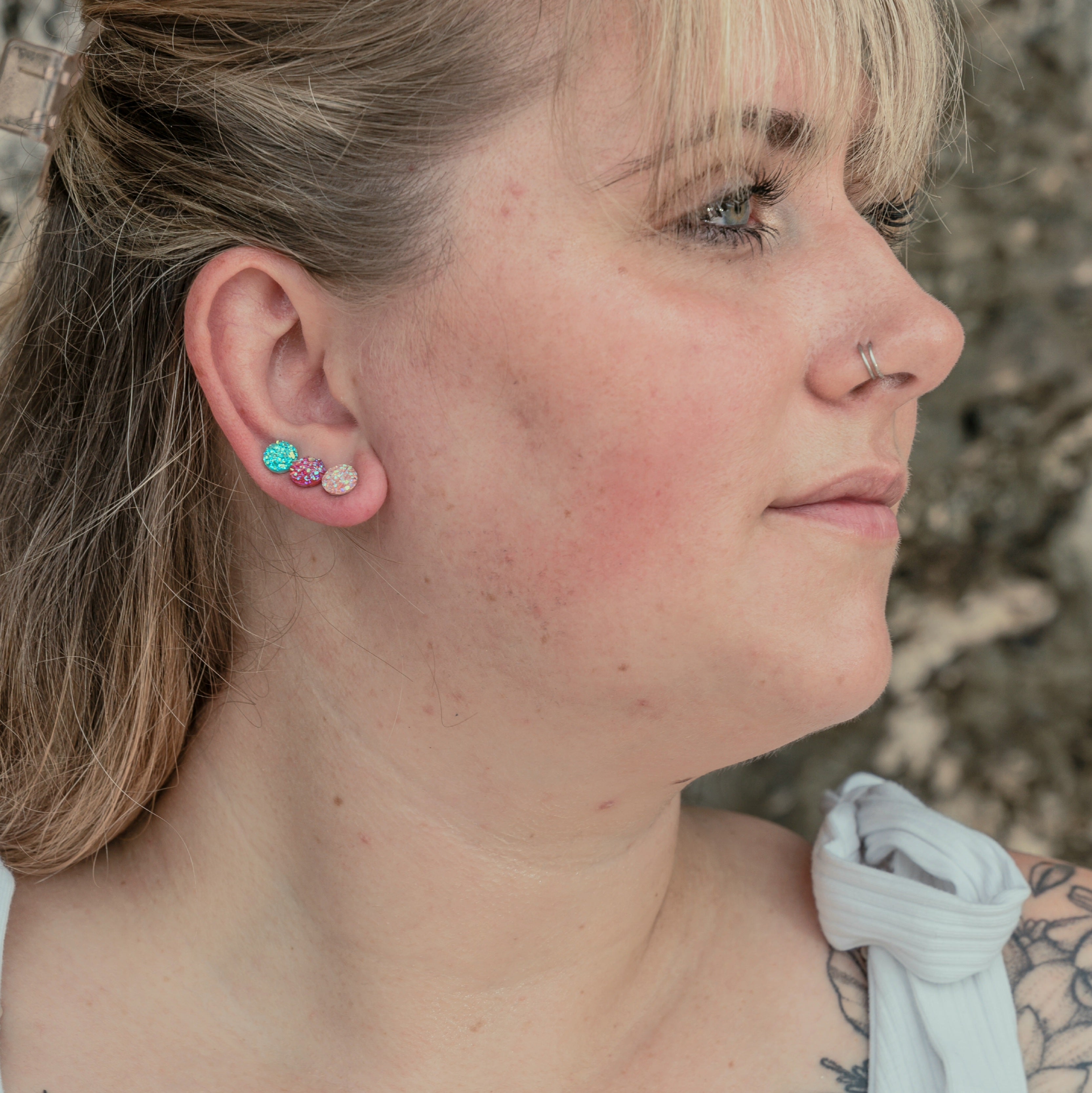 Add a pop of sparkle and color with our Oh Baby Trio! This set includes three mini druzy studs in blush, pink, and aqua, perfect for mixing and matching. Made with sparkling resin, these studs will add some fun to any outfit. Oh baby, you'll love these!