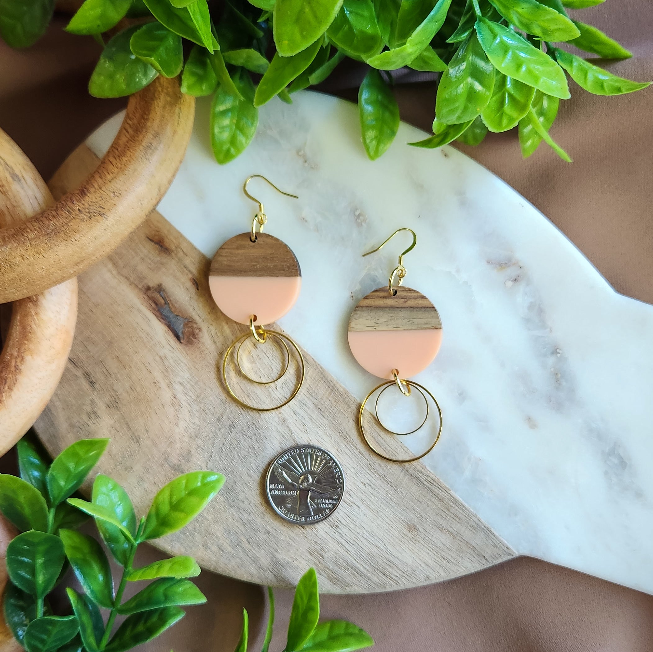 Add a touch of whimsy to your outfit with Pretty In Pink Dangles. These unique earrings feature a wood and resin round with two interlaying golden rings, attached below a golden stainless steel hook. Playful and eye-catching, these dangles are a fun addition to any jewelry collection.