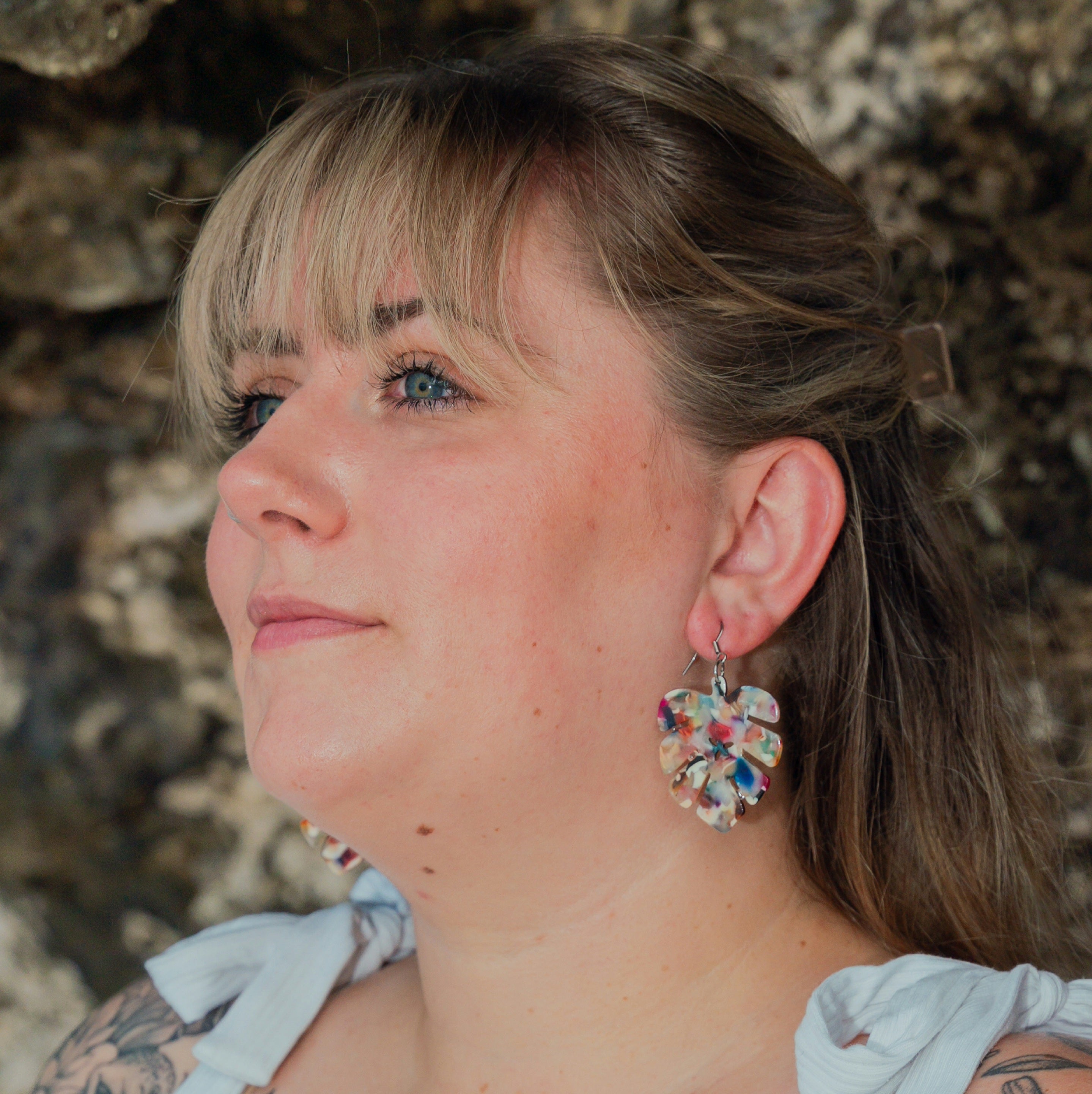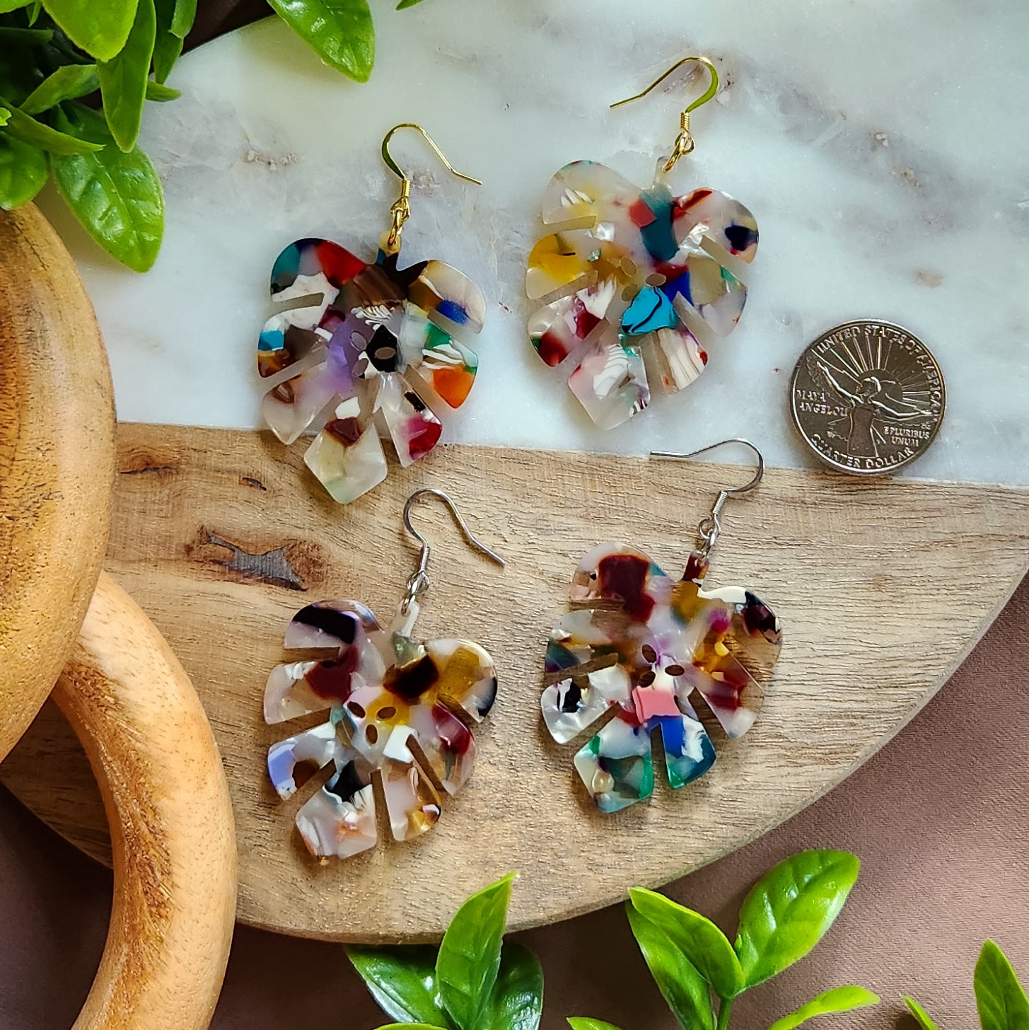 Introducing our Monstera Sassy Girl Dangles - a stunning representation of nature's beauty and sass. These earrings feature a large monstera leaf shape with a vibrant color palette of pinks, white, cream, purple, green, and blue, all crafted with high-quality resin. With options of a golden or silver stainless steel hook, these earrings offer versatility and style.