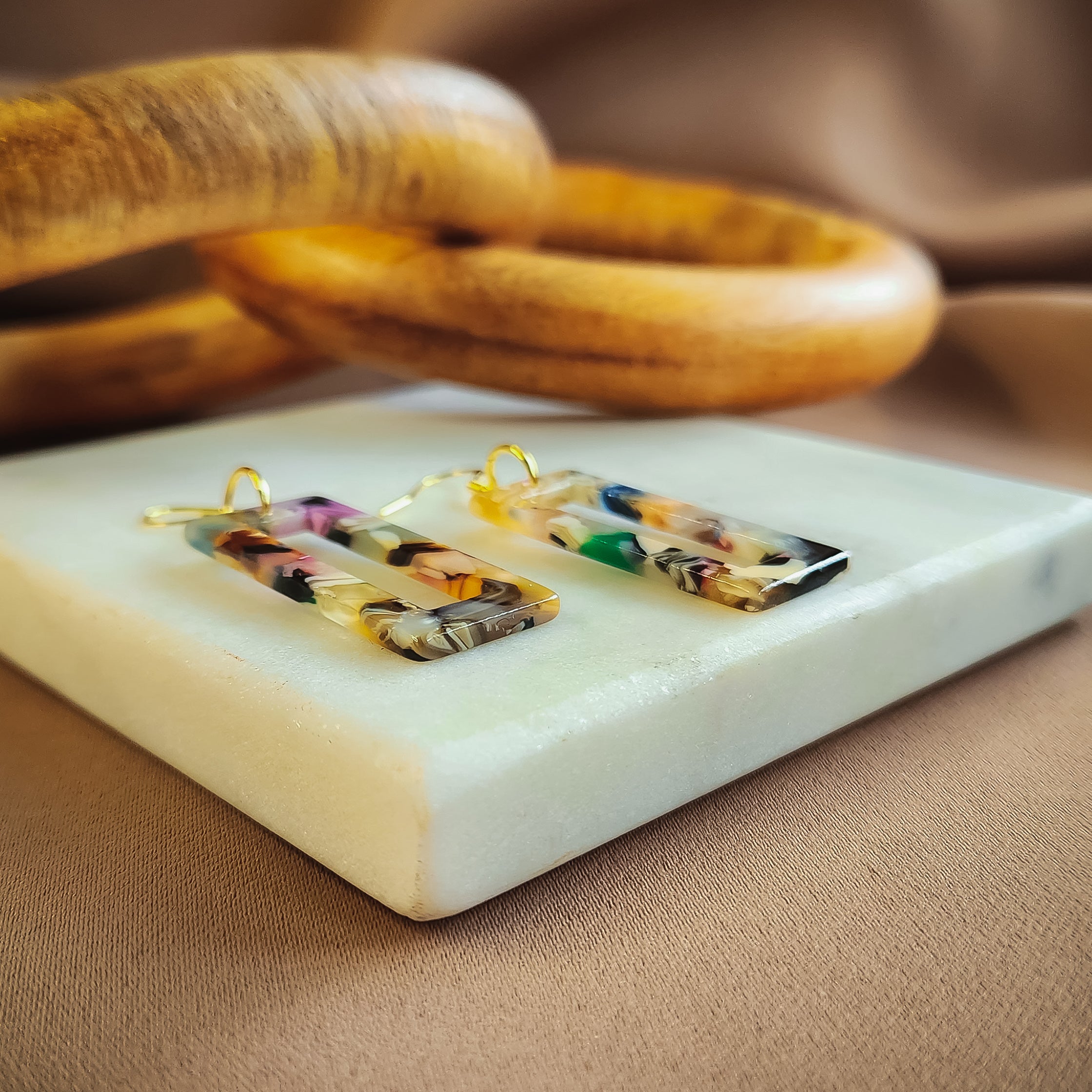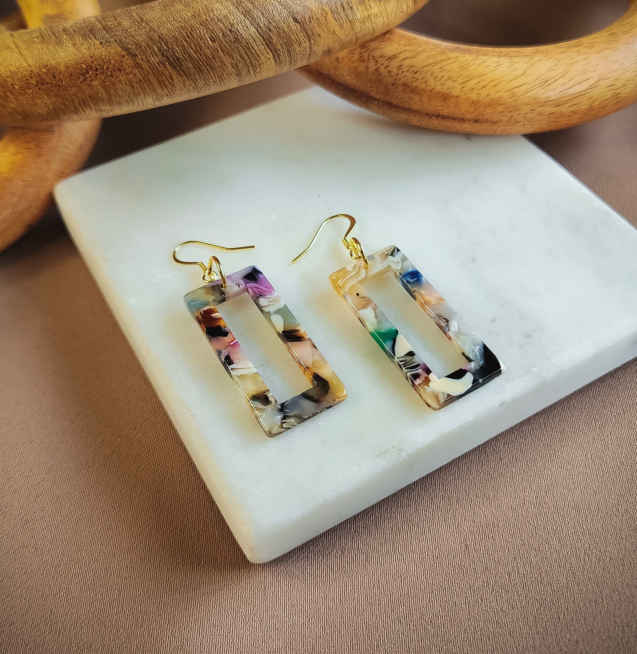 Introducing our Rectangle Sassy Girl Dangles - a harmonious blend of geometric elegance and vibrant colors. These earrings feature a sleek rectangular shape with a captivating palette of pinks, white, cream, purple, green, and blue. Crafted with high-quality resin, they offer both style and comfort.