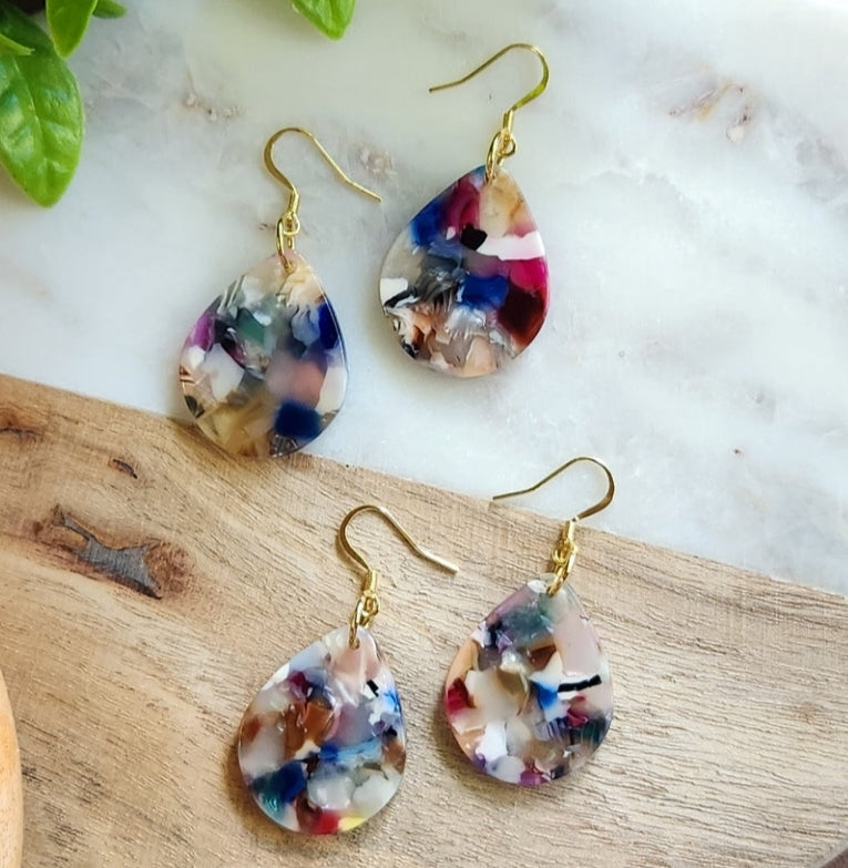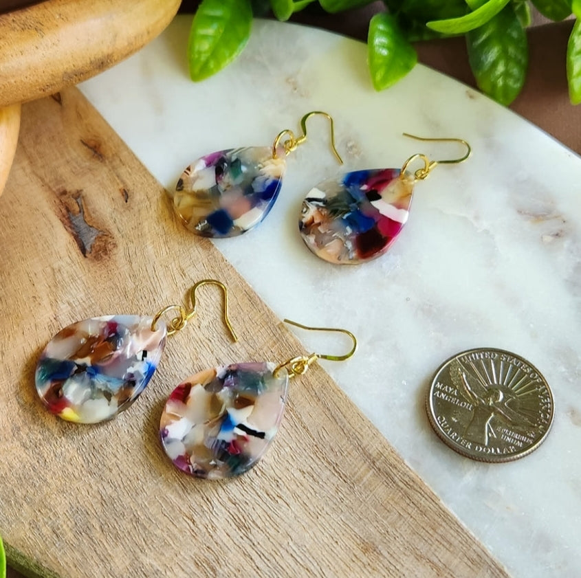 Introducing our Teardrop Sassy Girl Dangles - a stunning blend of elegance and vibrant hues. These earrings showcase a graceful teardrop shape, adorned with a captivating mix of pinks, white, cream, purple, green, and blue. Crafted with lightweight resin, they offer both comfort and style.