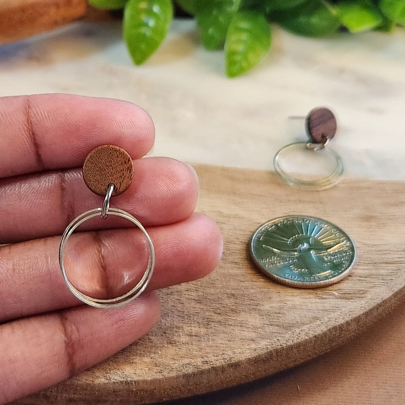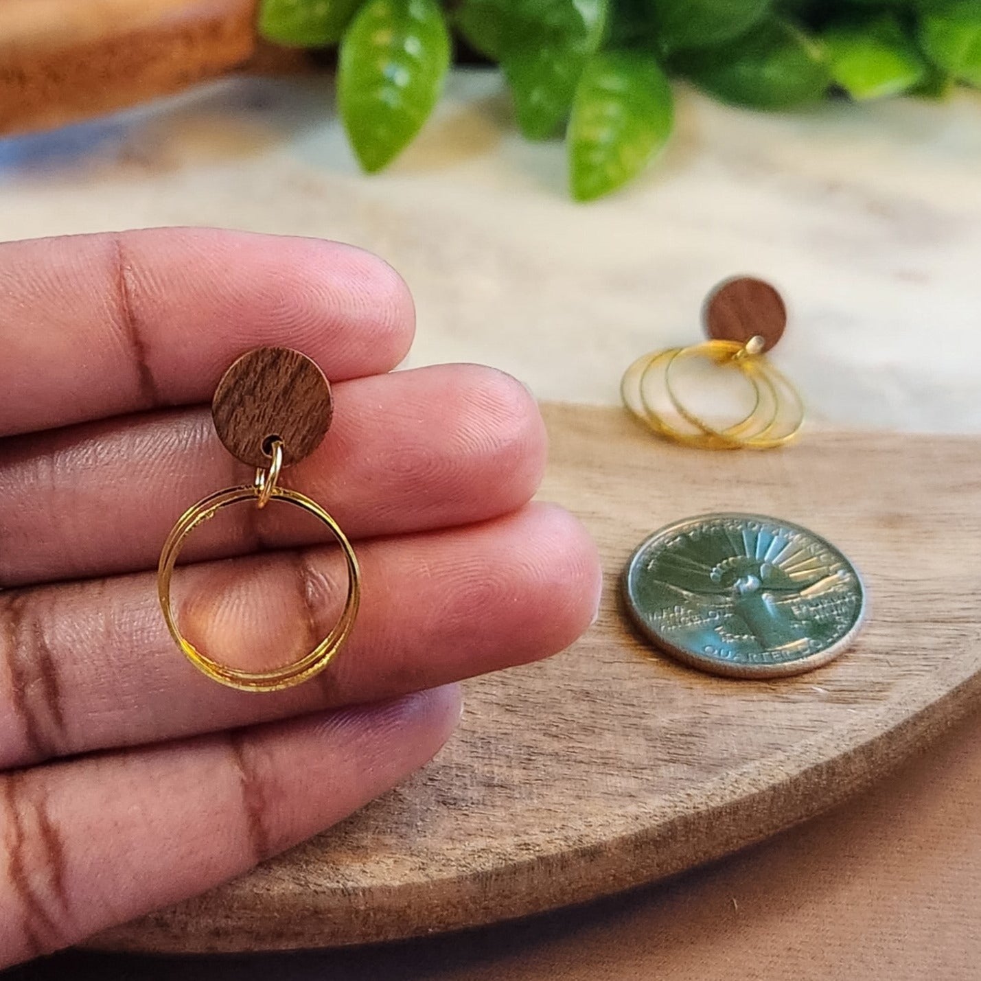 "Add a touch of whimsy to your outfit with Tomorrow's Dangles! These small 3-ring earrings feature a wooden round top stud post, available in silver and gold. Perfect for the playful minimalist. (Minimalist, but make it fun!)"
