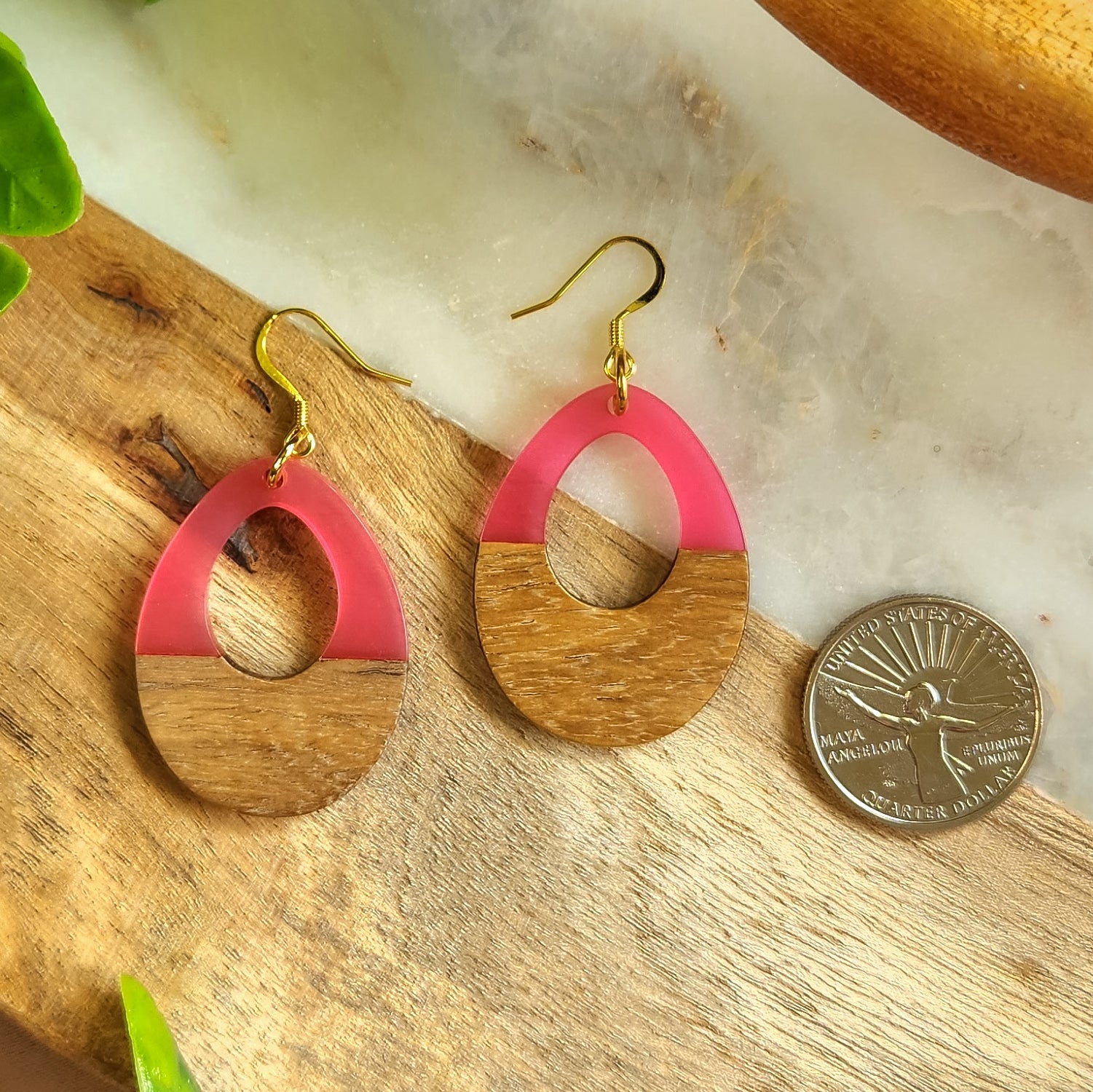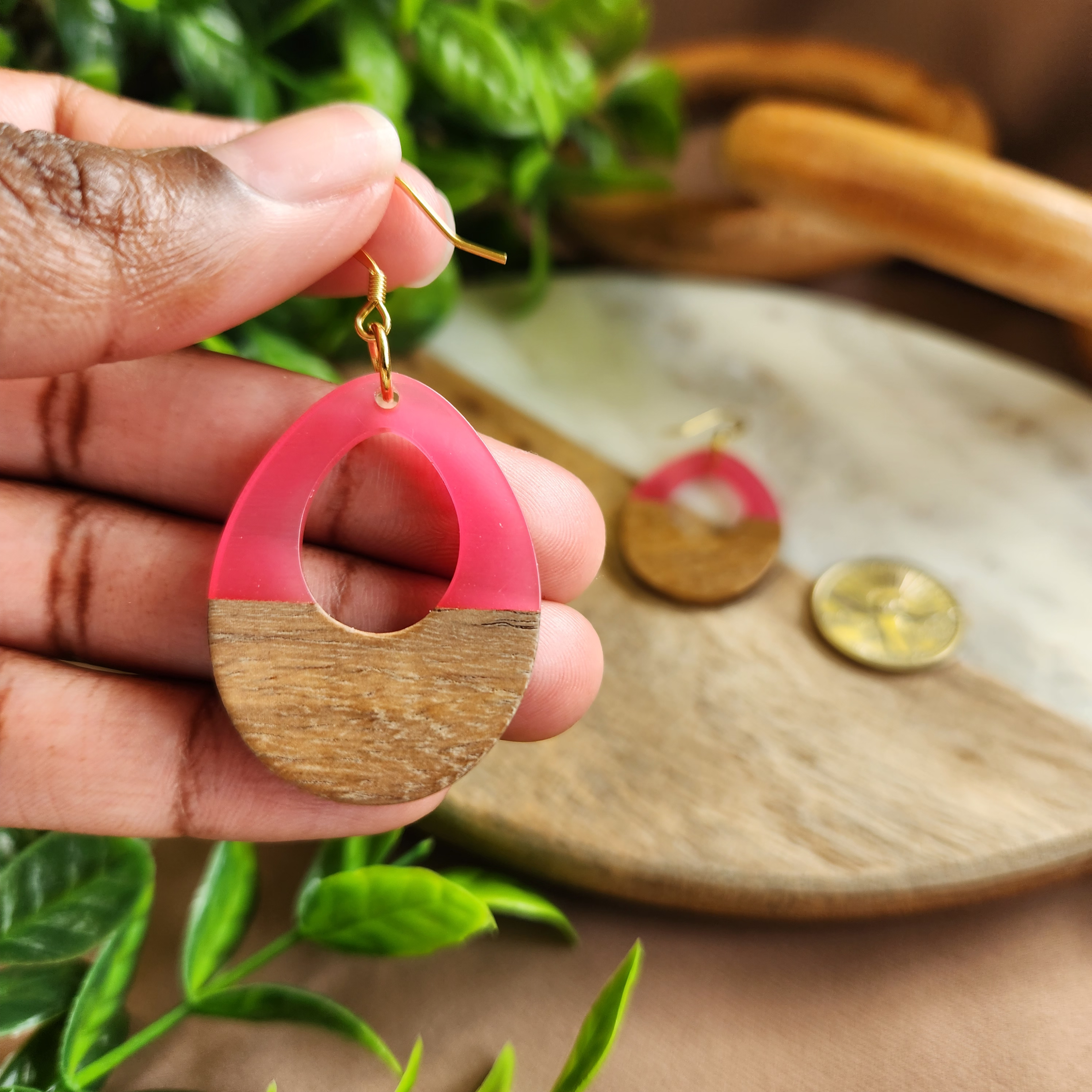 Crafted from sleek wood and vibrant pink resin, Yass Dangles feature a delicate teardrop shape with an intricate keyhole detail. Durably affixed to a stainless steel hook, these lightweight earrings will bring a touch of luxury to any look.